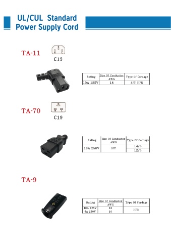 TA-11 C13 Size Of Conductor Rating Type Of Cordage AWG 10A 125V 18 SJT, HPN TA-70 C19 Rating Size Of Conductor Type Of Cordage AWG 14/3 16A 250V SJT 12/3 TA-9 Size Of Conductor Rating Type Of Cordage AWG 10A 125V 18 HPN 5A 250V 16
