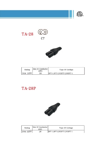 TA-28 C7 Size Of Conductor Rating Type Of Cordage AWG 10A 125V 18 SPT-1,SPT-2,NISPT-2,NISPT-1 TA-28P Rating Size Of Conductor Type Of Cordage AWG 10A 125V 18 SPT-1,SPT-2,NISPT-2,NISPT-1
