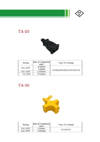 TA-25 Size Of Conductor Rating Type Of Cordage mm2 2.0mm2 15A 125V 1.8mm2 12A 125V 1.25mm2 VCTFK.HVCTFK.VCTF.HVCTF 7A 125V 0.75mm2 TA-36 Rating Size Of Conductor Type Of Cordage mm2 15A 125V 2.0mm2 12A 125V 1.25mm2 VCT.HVCT