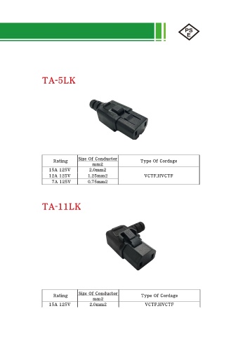 TA-5LK Size Of Conductor Rating Type Of Cordage mm2 15A 125V 2.0mm2 12A 125V 1.25mm2 VCTF.HVCTF 7A 125V 0.75mm2 TA-11LK Size Of Conductor Rating Type Of Cordage mm2 15A 125V 2.0mm2 VCTF.HVCTF