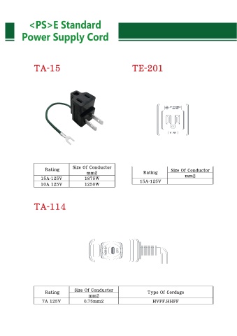 TA-15 TE-201 Size Of Conductor Rating Size Of Conductor mm2 Rating 15A-125V 1875W 15A-125V mm2 10A 125V 1250W TA-114 Size Of Conductor Rating Type Of Cordage mm2 7A 125V 0.75mm2 HVFF.HHFF