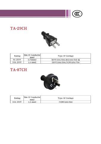 TA-29CH Size Of Conductor Rating Type Of Cordage mm2 6A 250V 0.75mm2 (RVV)300/500,(RX)300/500 扁 10A 250V 1.0 mm2 (RVV)300/500,(YCW)450/750 TA-87CH Rating Size Of Conductor Type Of Cordage mm2 16A 250V 1.5 mm2 (YZW)300/500