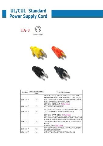 TA-39                             6-15P(Plug)                                                      Rating  Size Of Conductor           Type Of Cordage                                                             AWG                                                                        SJT,SJTW,SJTO,SJTOO,SJTOW,SJTOOW                                             10A 125V         18                                                                        SJT, SJTW, SJTO, SJTOW,SJTOOW                                                                        SJT,SJTW,SJTO,SJTOO,SJTOW, SJTOOW                                             13A 125V         16                                                                        SJT, SJTW, SJTO, SJTOW,SJTOOW                                                                         SJT,SJTW,SJTO,SJTOO,SJTOW,SJTOOW                                             15A 125V         14                                                                        SJT, SJTW, SJTO, SJTOW,SJTOOW                                                                         SJT, SJTO, SJTOW,SJTOOW                                             15A 125V         12                                                                        SJT, SJTW, SJTO, SJTOW,SJTOOW                        TA-67                             6-20P(Plug)                           W                           �                            Size Of Conductor                                               Rating                             Type Of Cordage                                                             AWG                                                                        HSJO,SJT,SJTW,SJTO,SJTOW,SJTOO,                                             20A 250V         12                                                                        SJTOOW,SJ,SJO, SJOO,SJOW, SJOOW