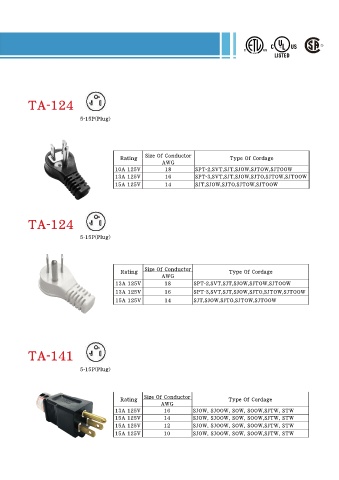 TA-115 L6-30P(Plug) Size Of Conductor Rating Type Of Cordage AWG 30A 250V 10 SJTW TA-117 L14-30P(Plug) Size Of Conductor Rating Type Of Cordage AWG 30A 125V 10 ST,STW,STO,STOW,STOO,STOOW 30A 250V TA-118 L14-30R(Receptacle) Size Of Conductor Rating Type Of Cordage AWG 30A 125V 10 ST,STW,STO,STOW,STOO,STOOW 30A 250V