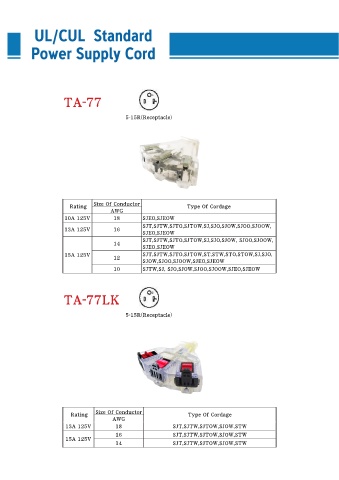 TA-11 C13 Size Of Conductor Rating Type Of Cordage AWG 10A 125V 18 SJT, HPN TA-70 C19 Rating Size Of Conductor Type Of Cordage AWG 14/3 16A 250V SJT 12/3 TA-9 Size Of Conductor Rating Type Of Cordage AWG 10A 125V 18 HPN 5A 250V 16