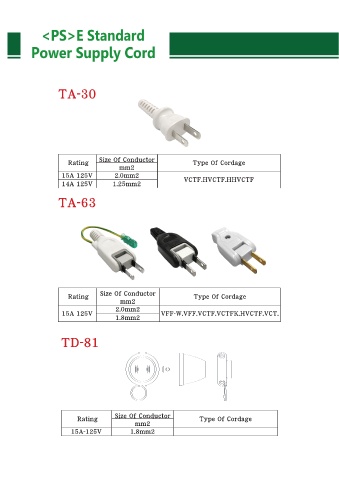 TA-82 Rating Size Of Conductor Type Of Cordage mm2 12A 125V 1.25mm2 VCTF.HVCTF.VCT.HVCT TA-82C Size Of Conductor Rating Type Of Cordage mm2 15A 125V 1.8mm2 VCT.HVCT 12A 125V 1.25mm2 TC-113 Size Of Conductor Rating Type Of Cordage mm2 15A 125V 2.0mm2 vct.hvct