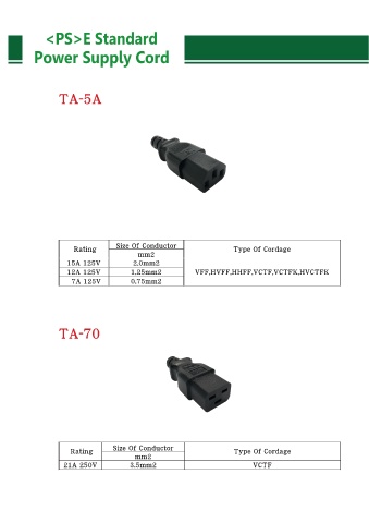 TA-87 3PIN TA-87 2PIN Size Of Conductor Rating Type Of Cordage mm2 15A 250V 1.5mm2 H05VV-F.H05RR-F.H05RN-F.TB-3C.H07RN-F.H03RT-H TA-87 Rating Size Of Conductor Type Of Cordage mm2 15A 250V 1.5mm2 H05VV-F.H05RR-F.H05RN-F TA-5A Size Of Conductor Rating Type Of Cordage mm2 0.75mm2 OD3CC 1.0A 250V 1.0mm2 HD3CC.OD3CC