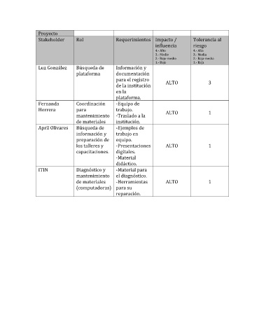 Stakeholder Rol Requerimientos Impacto / Tolerancia al