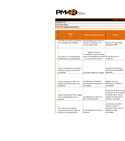 # Posible resultado (entonces) Síntoma Probabilidad (A/M/B) (A/M/B) Prioridad (1 - 9) Respuesta