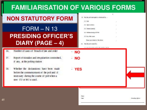 FAMILIARISATION OF VARIOUS FORMS NON STATUTORY FORM FORM – N 13 PRESIDING OFFICER’S DIARY (PAGE – 4) NO NO YES 45
