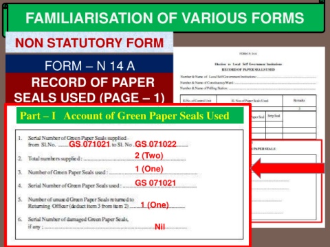 FAMILIARISATION OF VARIOUS FORMS NON STATUTORY FORM FORM – N 14 A RECORD OF PAPER SEALS USED (PAGE – 1) Part – I Account of Green Paper Seals Used GS 071021 GS 071022 2 (Two) 1 (One) GS 071021 1 (One) Nil 47