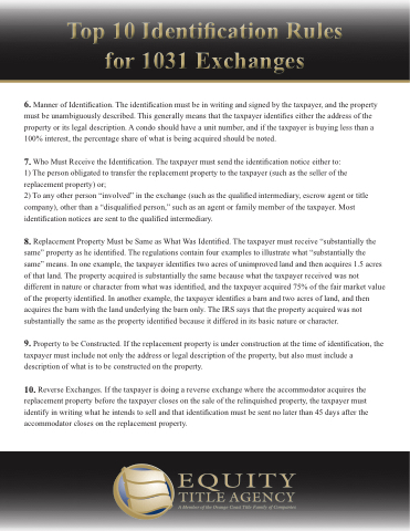 10. Reverse Exchanges. If the taxpayer is doing a reverse exchange where the accommodator acquires the replacement property before the taxpayer closes on the sale of the relinquished property, the taxpayer must identify in writing what he intends to sell and that identi cation must be sent no later than 45 days after the accommodator closes on the replacement property.