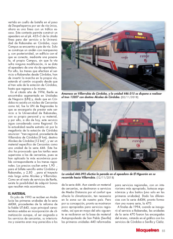 de la serie 446. Aun siendo un material de cercanías, se destinaron a servicios de Media Distancia por el confort que ofrecía la climatización, tan necesaria en la zona sur de nuestro país. Pero por su concepción, pronto se mostraron poco apropiadas para servicios regio- nales, así que en mayo del año siguien- te se recibieron en la base de material Autopropulsado de San Pablo (Sevilla) las primeras unidades 440 reformadas