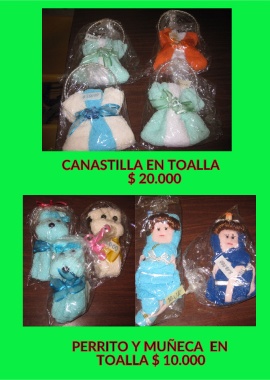 CANASTILLA EN TOALLA $ 20.000 PERRITO Y MUÑECA EN TOALLA $ 10.000