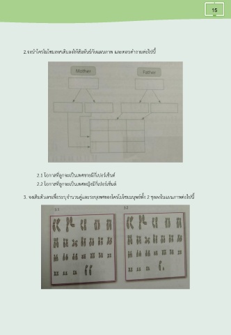 15 2.จงนําโครโมโซมเพศเติมลงให้สัมพันธ์กับแผนภาพ และตอบคําถามต่อไปนี้ 2.1 โอกาสที่ลูกจะเป็นเพศชายมีกี่เปอร์เซ็นต์ 2.2 โอกาสที่ลูกจะเป็นเพศหญิงมีกี่เปอร์เซ็นต์ 3. จงเติมตัวเลขเพื่อระบุจํานวนคู่และระบุเพศของโครโมโซมมนุษย์ทั้ง 2 ชุดลงในแผนภาพต่อไปนี้