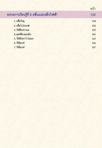 หน้า หน่วยการเรียนรู้ที่ 8 คลื่นแม่เหล็กไฟฟ้า 152 1. คลื่นวิทยุ 154 2. คลื่นไมโครเวฟ 156 3. รังสีอินฟราเรด 159 4. แสงที่ตามองเห็น 161 5. รังสีอัลตราไวโอเลต 163 6. รังสีเอกซ์ 166 7. รังสีเอกซ์ 167