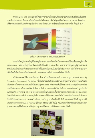 ปริซึมจะแยกออกเป็นแสงสีต่างๆ เรียกว่า สเปกตรัม ของแสง จะมีความถี่และความยาวคลื่น ดังรูปที่ 8.14