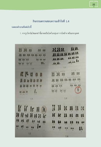 22 กิจกรรมตรวจสอบความเข้าใจที่ 1.4 จงตอบคําถามข้อต่อไปนี้ 1. จากรูปโครโมโซมเหล่านี้น่าจะเป็นโรคในกลุ่มอาการใดบ้าง พร้อมระบุเพศ