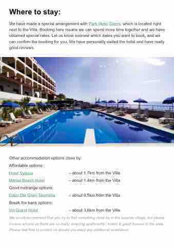We have made a special arrangement with Park Hotel Silemi, which is located right next to the Villa. Booking here means we can spend more time together and we have obtained special rates. Let us know soonest which dates you want to book, and we can confirm the booking for you. We have personally visited the hotel and have really good reviews.
