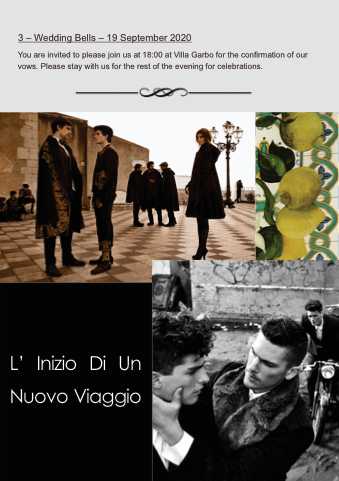 3 ā Wedding Bells ā 19 September 2020 You are invited to please join us at 18:00 at Villa Garbo for the confirmation of our vows. Please stay with us for the rest of the evening for celebrations. Lā Inizio Di Un Nuovo Viaggio