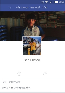 00:02 ชวัล ราชยอด สาขาบัญชี (แกป) Gap Chavan เบอร : 0612183869 EMAIL : 58120014@bac.ac.th