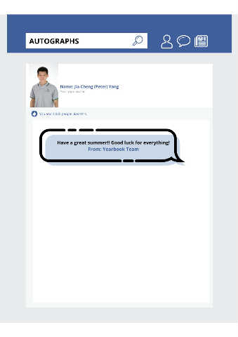 AUTOGRAPHS Name: Jia Cheng (Peter) Yang Yearbook owner You and 3,835 people liked this. Have a great summer!! Good luck for everything! From: Yearbook Team