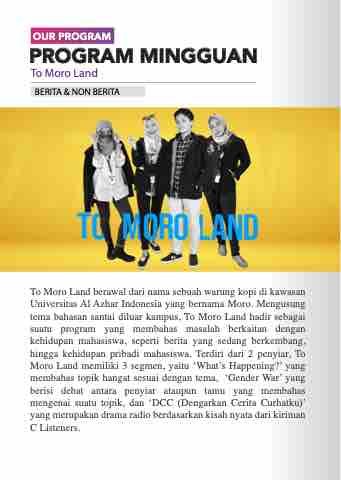 To Moro Land berawal dari nama sebuah warung kopi di kawasan Universitas Al Azhar Indonesia yang bernama Moro. Mengusung tema bahasan santai diluar kampus, To Moro Land hadir sebagai suatu program yang membahas masalah berkaitan dengan kehidupan mahasiswa, seperti berita yang sedang berkembang, hingga kehidupan pribadi mahasiswa. Terdiri dari 2 penyiar, To Moro Land memiliki 3 segmen, yaitu ‘What’s Happening?’ yang membahas topik hangat sesuai dengan tema, ‘Gender War’ yang berisi debat antara penyiar ataupun tamu yang membahas mengenai suatu topik, dan ‘DCC (Dengarkan Cerita Curhatku)’ yang merupakan drama radio berdasarkan kisah nyata dari kiriman C Listeners.
