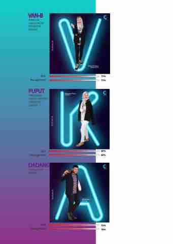 VAN-B MARCOM ANNOUNCER OPERATOR EDITOR PUPUT PRODUCER SCRIPT WRITTER OPERATOR EDITOR DADANG ANNOUNCER EDITOR 75% 75% 80% 80% 75% 70%