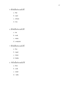 97 5. ข้อใดเป็นค านามนับได้ a. bus b. sand c. cheese d. rice 6. ข้อใดเป็นค านามนับได้ a. tea b. rock c. water d. computer 7. ข้อใดเป็นค านามนับได้ a. boy b. sugar c. water d. butter 8. ข้อใดเป็นค านามนับได้ a. beer b. milk c. water d. radio