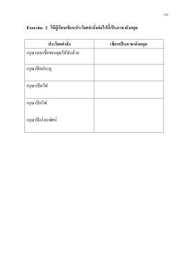 126 Exercise 2 ให้ผู้เรียนเขียนประโยคค าสั่งต่อไปนี้เป็นภาษาอังกฤษ ประโยคค าสั่ง เขียนเป็นภาษาอังกฤษ กรุณาบอกชื่อของคุณให้ฉันด้วย กรุณาปิดประตู กรุณาเปิดไฟ กรุณาปิดไฟ กรุณาปิดโทรทัศน์