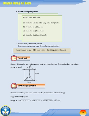 Untuk mencari luas permukaan prisma tersebut, terlebih dahulu kita cari tinggi