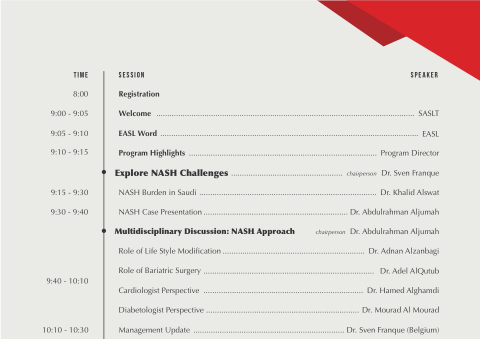 Explore NASH Challenges ................................................... chairperson Dr. Sven Franque NASH Burden in Saudi ................................................................................. Dr. Khalid Alswat NASH Case Presentation .................................................................. Dr. Abdulrahman Aljumah