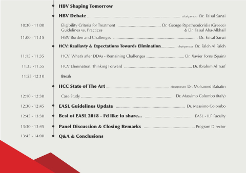 HBV Burden and Challenges ............................................................................ Dr. Faisal Sanai HCV: Realiavty & Expectations Towards Eliminatio.n................ chairperson Dr. Faleh Al Faleh