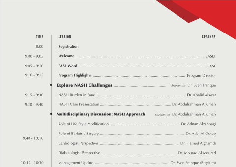Explore NASH Challenges ................................................... chairperson Dr. Sven Franque NASH Burden in Saudi ................................................................................. Dr. Khalid Alswat NASH Case Presentation .................................................................. Dr. Abdulrahman Aljumah