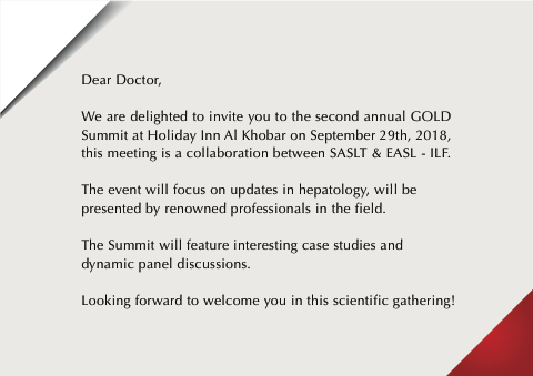 We are delighted to invite you to the second annual GOLD Summit at Holiday Inn Al Khobar on September 29th, 2018, this meeting is a collaboration between SASLT & EASL - ILF.