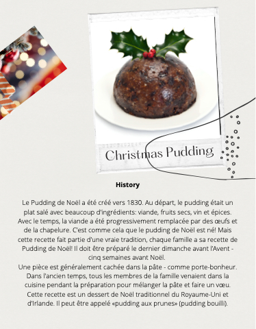 Le Pudding de Noël a été créé vers 1830. Au départ, le pudding était un plat salé avec beaucoup d'ingrédients: viande, fruits secs, vin et épices. Avec le temps, la viande a été progressivement remplacée par des œufs et de la chapelure. C’est comme cela que le pudding de Noël est né! Mais cette recette fait partie d'une vraie tradition, chaque famille a sa recette de Pudding de Noël! Il doit être préparé le dernier dimanche avant l’Avent -