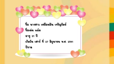 ชื่อ นางสาว เหมือนฝัน เจริญรัมย์ ชื่อเล่น แอ๋ม อายุ 21 ปี เกิดวัน เสาร์ ที่ 27 มิถุนายน พ.ศ. 2541 ปีขาล