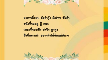 อาหารที่ชอบ ต้มย ากุ้ง ผัดไทย ส้มต า หนังที่ชอบดู บู๊ ตลก เพลงที่ชอบฟัง สตริง ลูกทุ่ง สิ่งที่อยากท า อยากท าให้พ่อแม่สบาย