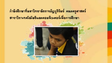 ก าลังศึกษาที่มหาวิทยาลัยราชภัฏบุรีรัมย์ คณะครุศาสตร์ สาขาวิชาเทคโลโลยีและคอมพิวเตอร์เพื่อการศึกษา