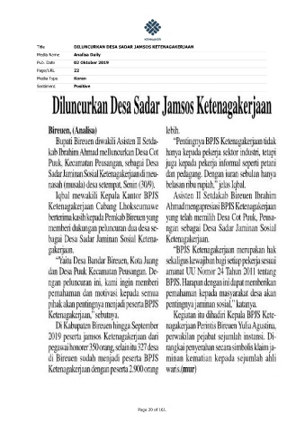 Title DILUNCURKAN DESA SADAR JAMSOS KETENAGAKERJAAN Media Name Analisa Daily Pub. Date 02 Oktober 2019 Page/URL 22 Media Type Koran Sentiment Positive Page 20 of 161.