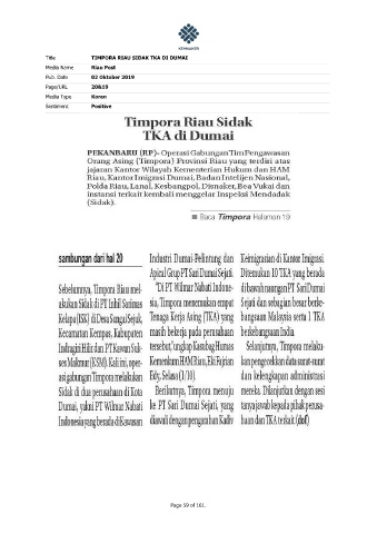 Title TIMPORA RIAU SIDAK TKA DI DUMAI Media Name Riau Post Pub. Date 02 Oktober 2019 Page/URL 20&19 Media Type Koran Sentiment Positive Page 59 of 161.