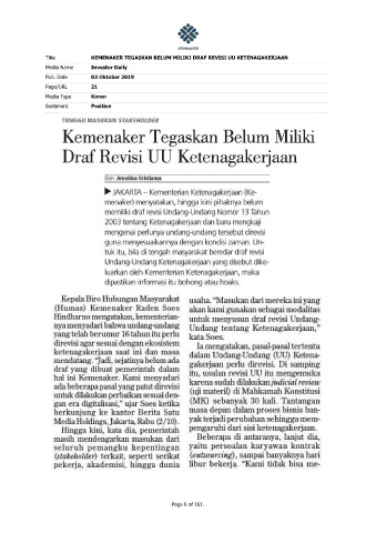 Title KEMENAKER TEGASKAN BELUM MILIKI DRAF REVISI UU KETENAGAKERJAAN Media Name Investor Daily Pub. Date 03 Oktober 2019 Page/URL 21 Media Type Koran Sentiment Positive Page 6 of 161.