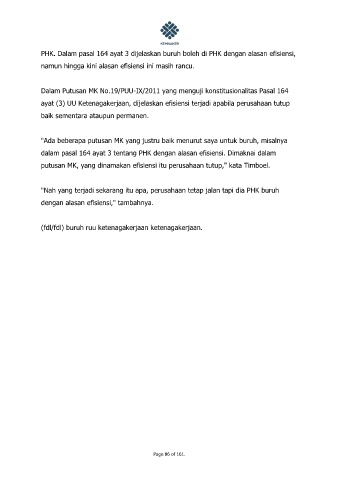 dalam pasal 164 ayat 3 tentang PHK dengan alasan efisiensi. Dimaknai dalam