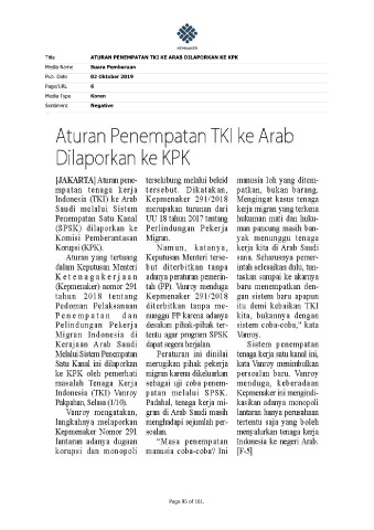 Title ATURAN PENEMPATAN TKI KE ARAB DILAPORKAN KE KPK Media Name Suara Pembaruan Pub. Date 02 Oktober 2019 Page/URL 6 Media Type Koran Sentiment Negative Page 95 of 161.