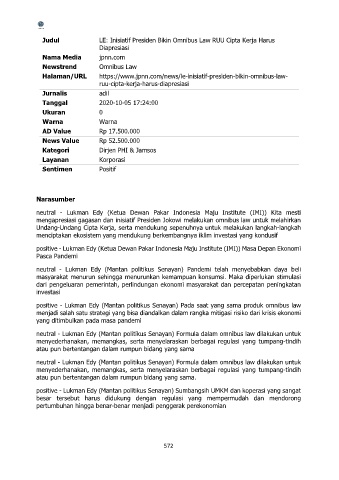 positive - Lukman Edy (Mantan politikus Senayan) Pada saat yang sama produk omnibus law