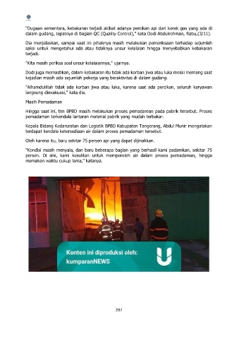 Hingga saat ini, tim BPBD masih melakukan proses pemadaman pada pabrik tersebut. Proses