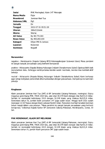tingginya gelombang PHK. PADA 2020 lalu, ada total 38.379 klaim dengan nilai Rp411,9 miliar.