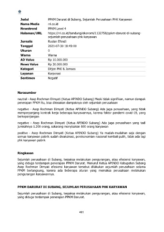 yang diduga terdampak penerapan PPKM Darurat. Menurut Ketua APINDO Kabupaten Subang