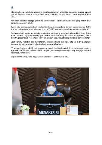 Lebih lanjut, Menaker Ida menyatakan, bantuan subsidi gaji Rp1 juta ini akan disalurkan