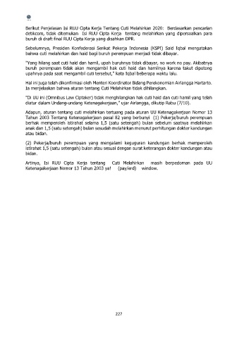 "Di UU ini (Omnibus Law Ciptaker) tidak menghilangkan hak cuti haid dan cuti hamil yang telah